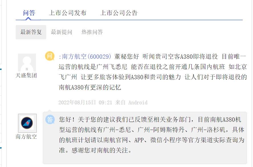 民航資源網2022年9月20日消息:據上證e互動平臺,有投資者向南方航空提問,董秘您好聽聞貴司空客A380即將退役目前唯一運營的航線是廣州飛悉尼,能否在退役之前開通幾條國內航班如北京飛廣州,讓更多旅客體驗到A380和貴司的魅力讓人們對于即將退役的南航A380有更深的記憶