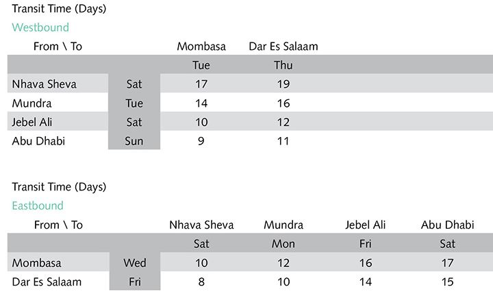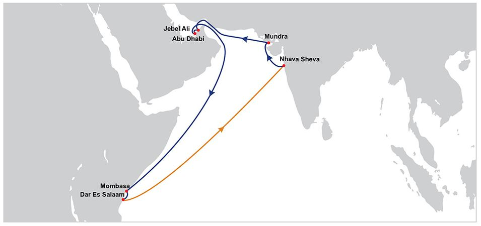 新產品的港口輪換將是恩哈瓦謝瓦(印度)-蒙德拉(印度)-Jebel Ali(阿拉伯聯合酋長國)-阿布扎比(阿拉伯聯合共和國)-蒙巴薩(肯尼亞)-達累斯薩拉姆(坦桑尼亞)-Nhava Sheva。