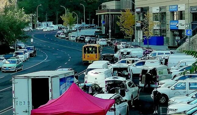 11 月 4 日 7:30,記者來到現場,看見馬路上早已橫七豎八地停放著十余輛車,部分車輛打開了后備廂蓋,身著順豐工裝的工作人員圍繞在車身周圍裝揀快遞。由于該路段兩排車道均被占用,行駛通過此處的車輛只能越過雙黃線借用對向車道行駛。