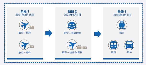 ICS2會在3年的過渡期內,對不同的運輸渠道分三個階段上線實施。