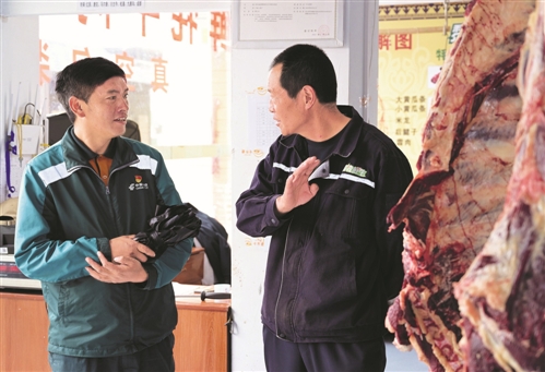 哈弄奪機向牦牛肉商戶了解最新的市場行情。□新華社記者 李賀 攝