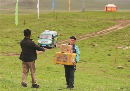 看到郵車來了,牧民迫不及待地迎上去接過自己網購的商品。□《工人日報》記者 王偉偉 攝