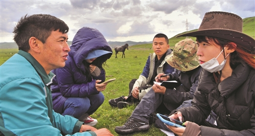 投遞間隙,哈弄奪機在草原上席地而坐,接受記者聯訪。□中國飛時達國際快遞公司報記者 張晨昱 攝