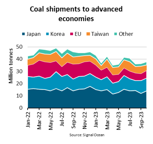 “在2023年前10個月,由于電力需求下降和可再生能源發電份額上升,向發達經濟體的煤炭出貨量同比下降了17%。經濟活動放緩和能源價格高企也影響了電力需求,”BIMCO航運分析師菲利佩•古維亞表示。