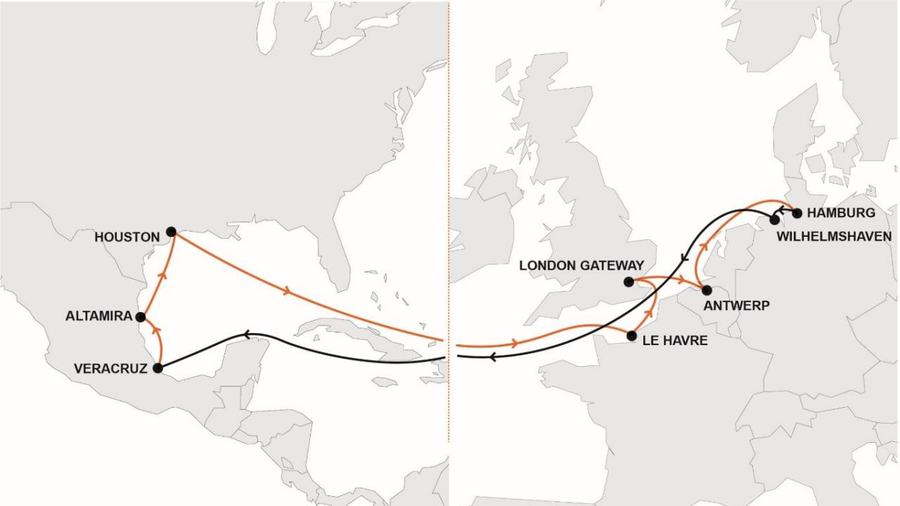 勒阿弗爾(法國)-倫敦門戶(英國)-安特衛普(比利時)-漢堡(德國)-威廉港(德國)-韋拉克魯斯(墨西哥)-阿爾塔米拉(墨西哥)-休斯頓(美國)