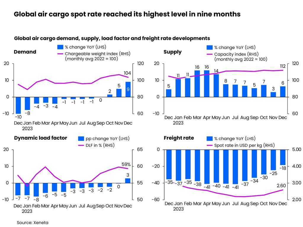 數據提供商Xeneta的數據顯示,12月份航空貨運需求同比增長9%,盡管這在一定程度上反映了2022年底的疲軟,而現貨價格達到了9個月來的最高水平,為每公斤2.60美元,動態載客率上升了3%,達到59%。