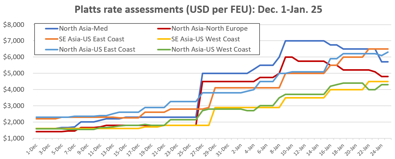 普氏能源資訊周四公布的北亞-地中海現貨價格為每40英尺當量5,700美元,較1月9日至15日觸及的高點下跌19%。該公司對北亞-北歐的評估為每FEU 4,800美元,較1月9日至10日的高點下跌了20%。